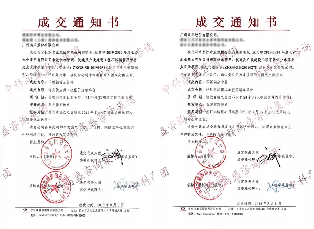 克日,Z6尊龙凯时收到中科高盛咨询集团有限公司发出的成交通知书。在长沙水业集团有限公司2019-2020年度市政供水管网、统建及户改建设工程不锈钢管及管件定点采购项目、2019-2020年度市政供水管网、统建及户改建设工程不锈钢分水器定点采购项目招标中,确定公司中标。